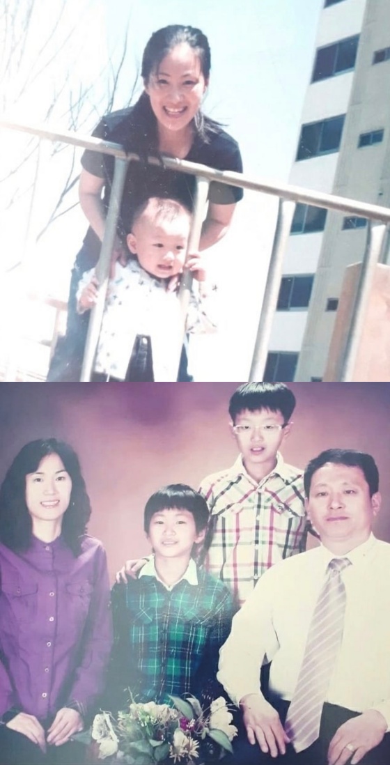사진 속에는 볼살 통통한 아기가 있다. 다른 사진은 가족사진으로, 부모를 쏙 빼닮은 이찬원의 어린 시절 얼굴이 눈에 띈다.