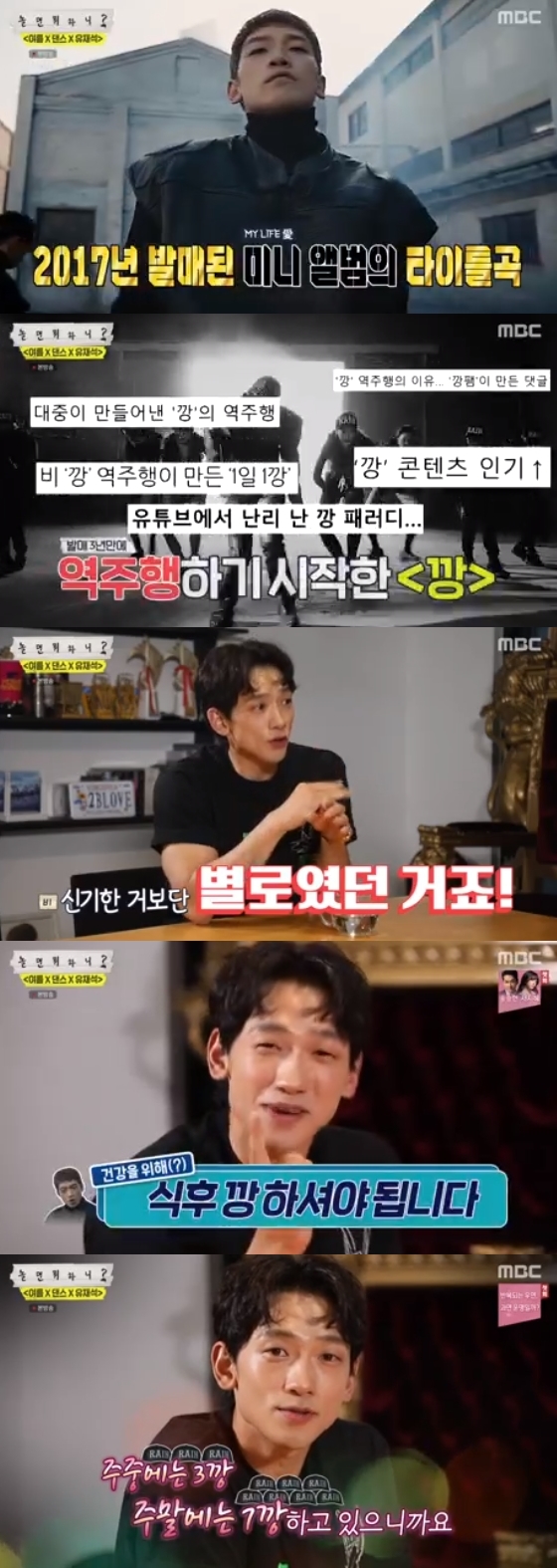 비는 지난 16일 방송된 MBC '놀면 뭐하니?'에 출연, 혼성그룹 도전을 위해 자신을 찾아온 유재석과 많은 이야기를 나눴다. 비는 이날 2020년 여름 가요계를 목표로 준비하고 있는 써머곡과 혼성 그룹 제작에 대해 고민하고 있는 유재석에게 인기 댄스 가수로 활동했던 자신만의 노하우를 전수하는 한편, 데뷔곡 '나쁜 남자'에서부터 '안녕이란 말대신', '태양을 피하는 방법', 'It's Raining', 'Rainism', '널 붙잡을 노래', 'LA SONG'을 거쳐 '깡'까지 자신이 발표한 여러 히트곡을 되짚어보는 모습을 보였다.