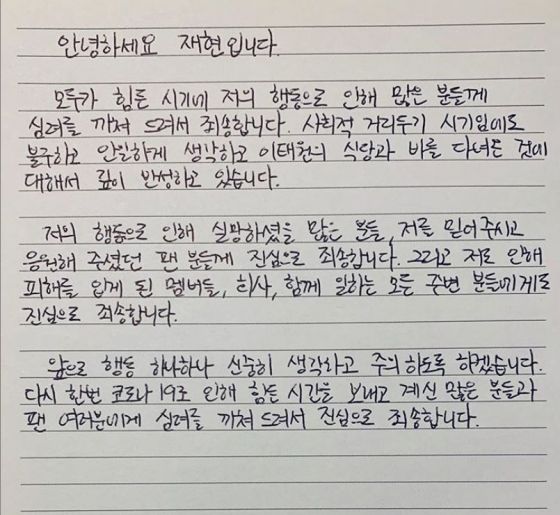 아이돌그룹 NCT 127 멤버로 활동하고 있는 재현(23)이 코로나19 재확산 여파 우려 지역으로 지적됐던 서울 이태원 인근 음식점 및 주점을 방문한 것에 대해 자필 편지와 함께 재차 사과의 뜻을 전했다.