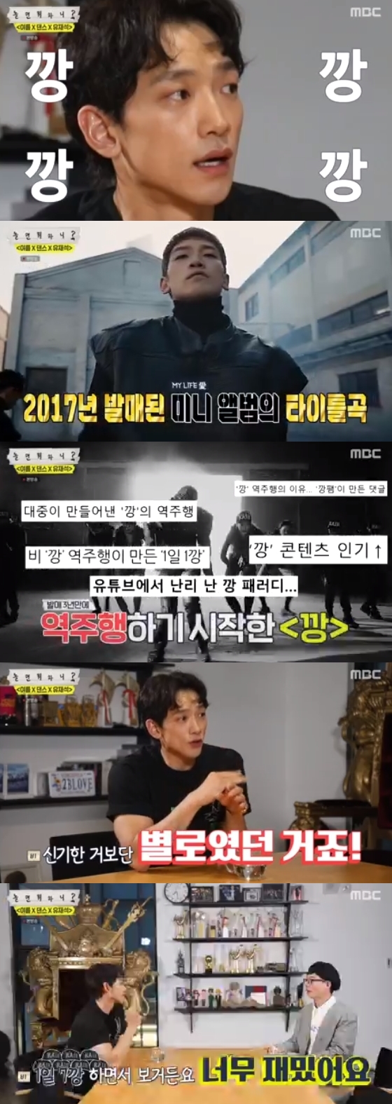 역주행에 힘을 보탠 것은 MBC 예능 프로그램 '놀면 뭐하니?'다. 비는 지난 16일 방송에 출연 '1일 1깡'을 둘러싼 조롱 섞인 반응들에 쿨하게 대처하는 모습을 보이며 호감 분위기를 이끌어냈다.