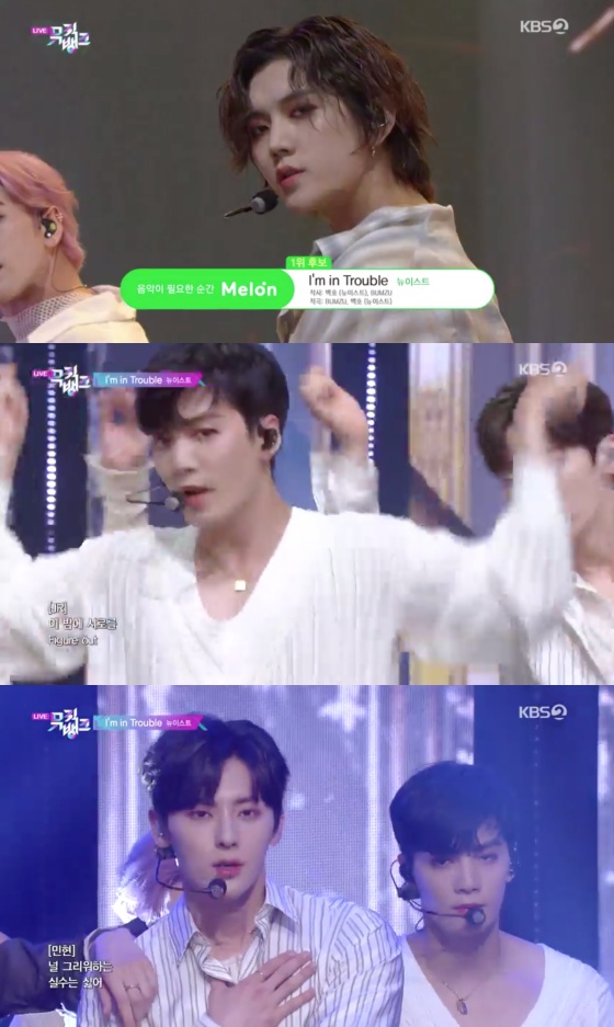 그룹 뉴이스트가 '뮤직뱅크'에서 신곡 'I'm in Trouble' 무대로 도발적인 비주얼을 뽐냈다.