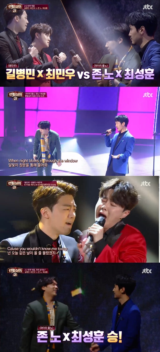 22일 오후 방송된 JTBC 예능 프로그램 '팬텀싱어3'에서 길병민, 최민우로 구성된 '병민우'팀과 존노, 최성우로 구성된 '와이리좋노'팀이 대결을 펼쳤다.