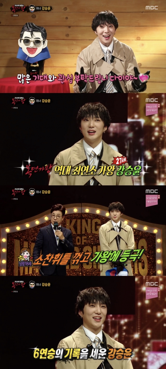 강승윤은 25일 '복면가왕' 제작진을 통해 주윤발로 활약한 자신의 행보에 대한 이야기를 전했다. 강승윤은 '복면가왕'에서 주윤발로 등장하며 3개월 여 동안 무대를 장악하며 122대~127대 가왕으로 등극, 6연승을 차지하며 최연소 가왕, 아이돌 최초 6연승 가왕, 최초 무관객 연승 가왕 등의 타이틀을 얻었다.