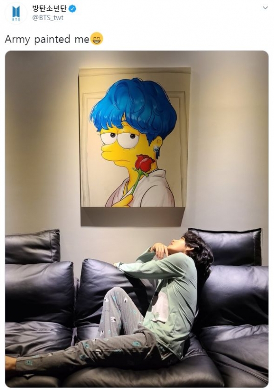 뷔는 지난 25일 방탄소년단의 공식 트위터 계정을 통해 "Army painted me"(아미가 나를 그려줬다"는 글과 함께 아미'(방탄소년단 팬)가 그려준 심슨 스타일의 초상화를 공개했다. 앞서 뷔가 팬들에게 그려달라고 부탁한 것을 방탄소년단 공식 SNS를 통해 '인증'한 것.