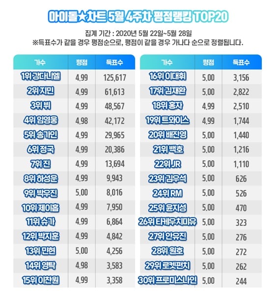 가수 강다니엘이 5월 4주차 아이돌차트 평점랭킹에서 최다득표를 기록했다.