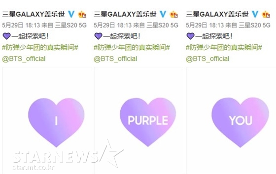 삼성이 웨이보에 올린 "I PURPLE YOU"라는 문구는 방탄소년단과 전 세계 아미들(BTS 팬덤명)이 사용하는 용어로 ‘일곱 빛깔 무지개의 마지막 색처럼 끝까지 함께 사랑하자는 의미를’ 담고 있다.