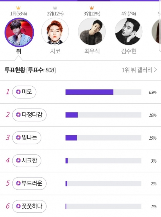 커뮤니티 포털사이트인 디시인사이드와 취향 검색 기업 마이셀럽스가 운영 중인 익사이팅 디시에서 지난 5월 24일에서 30일까지 '무쌍이 잘 어울리는 매력만점 스타'라는 주제로 투표를 실시한 결과 뷔는 총 1527표 중 808표(53%)의 압도적인 지지율로 1위를 차지했다.