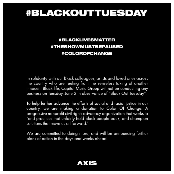 액시즈는 화요일 업무 활동을 멈추는 것으로 흑인 커뮤니티에 대한 지지와 발전된 사회를 위해 음악 산업이 할 수 있는 일들을 생각해보는 계기를 만들고자 이번 캠페인에 참여하게 됐다.