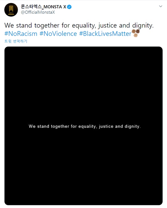 몬스타엑스 측은 4일 공식 트위터에 검은 배경을 바탕으로 "We stand together for equality, justice and dignity"(우리는 평등, 정의, 존엄을 지지한다)는 글이 적힌 이미지를 게재했다.