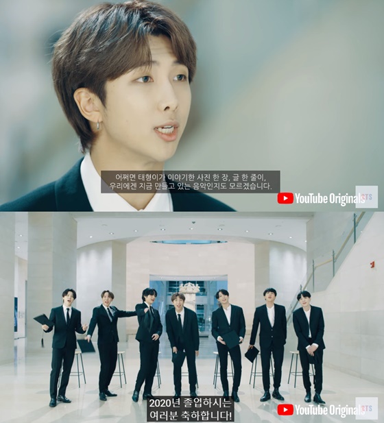 방탄소년단은 8일 오전 4시(한국시간 기준) 유튜브가 주최한 온라인 졸업식 '디어 클래스 오브 2020'(Dear Class of 2020)에서 축사를 전했다. 이번 행사는 유튜브가 신종 코로나 바이러스 감염증(코로나19) 여파로 졸업식에 가지 못하는 졸업생들을 위해 주최한 온라인 졸업식이다.