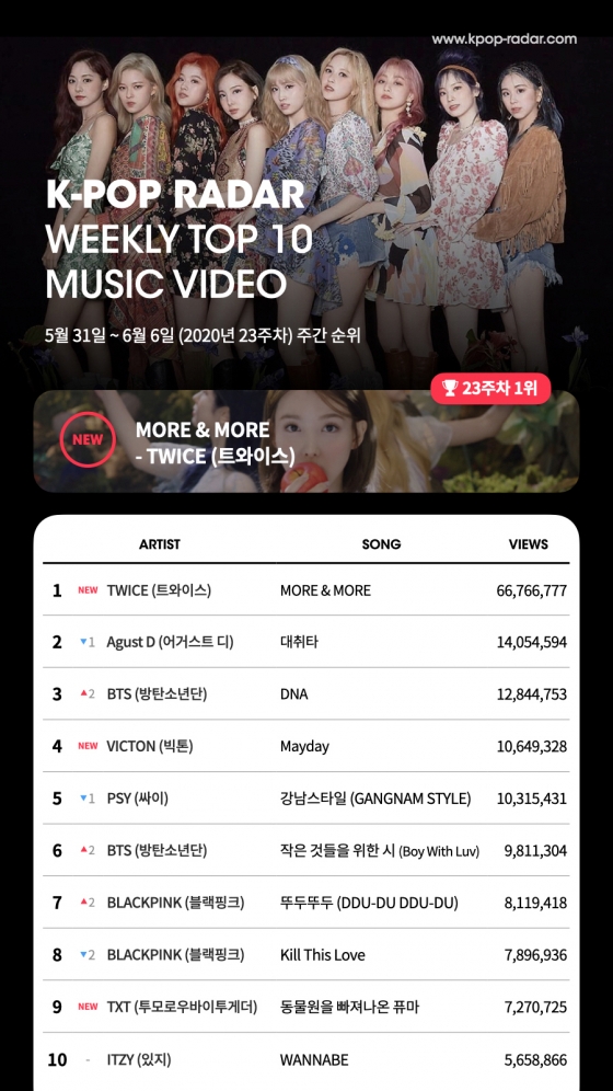 걸그룹 트와이스 신곡 'MORE & MORE'(모어 앤드 모어) 뮤직비디오가 케이팝 레이더 주간 유튜브 조회수 차트 1위를 달성했다.
