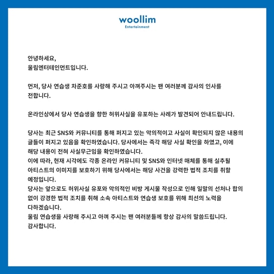 울림은 "먼저 당사 연습생 차준호를 사랑해 주시고 아껴주시는 팬 여러분께 감사의 인사를 전합니다"면서 "온라인상에서 당사 연습생을 향한 허위사실을 유포하는 사례가 발견되어 안내드립니다"고 했다.