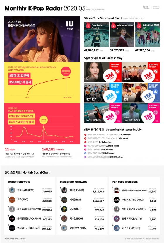 케이팝 레이더는 11일 "아이유가 음원은 물론, 5월 뮤직비디오 조회수 부문 2위에 오르고, 유튜브 구독자와 인스타그램 팔로워가 각각 300만과 1400만을 돌파하는 등 여러 기록을 달성했다"라고 밝히고 아이유가 5월 '이달의 아티스트'로 선정됐다고 전했다.