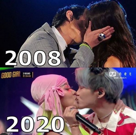 엠넷 '굿걸' 출연자 퀸 와사비(26, 김소희)와 무대에 함께 선 타쿠와(25, 김정석)가 기습적인 '뽀뽀 퍼포먼스'로 화제의 중심에 섰다. 퀸 와사비는 심지어 무려 12년 전에도 등장했던 빅뱅 탑과 이효리의 뽀뽀 퍼포먼스까지 소환하고 나섰다.