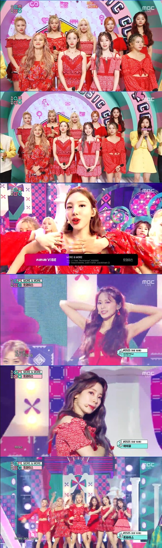 트와이스는 곡 'MORE & MORE'에 맞춰 컴백 무대를 꾸몄다. 이들은 빨간색의 강렬한 의상을 착용하고 사랑스러움을 뽐냈다.
