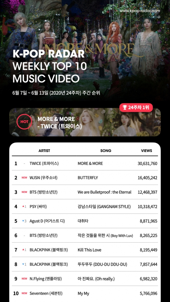 지난 1일 공개된 트와이스 신곡 '모어 앤드 모어'(MORE & MORE) 뮤직비디오는 케이팝 레이더 2020년 24주 차 집계 기간(6월 7일~6월 13일) 동안 약 3,063만 뷰를 기록하며 2주 연속 케이팝 레이더 유튜브 조회수 차트에서 1위를 차지했다.