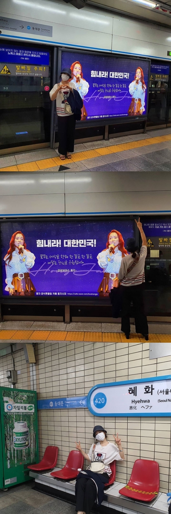 홍자는 지난 16일 자신의 인스타그램에 "혜화역 응원 광고. 대한민국 힘내라! 청춘이여 힘내라! 감사합니다 나의 팬. #사랑해 영원히 홍일병 #내 삶의 전부"라는 글과 함께 세 장의 사진을 게재했다.