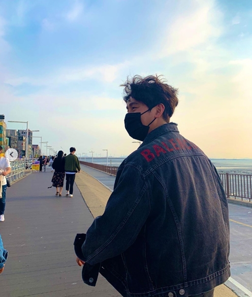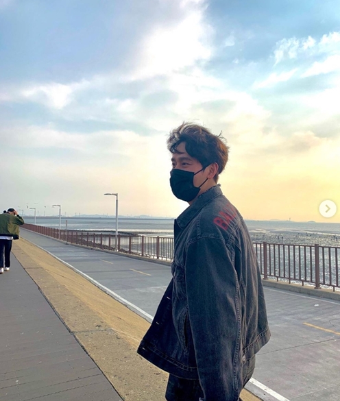 공개 된 사진 속 김상혁은 노을 지는 바다를 배경으로 걷고 있다. 검정색 마스크를 쓰고 있지만 웃고 있는 모습이다.