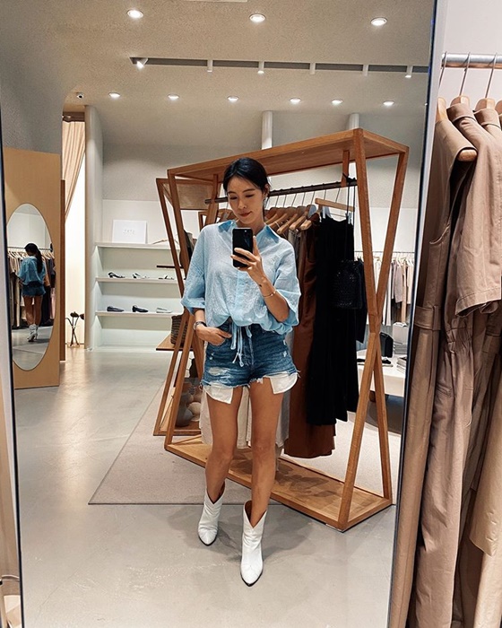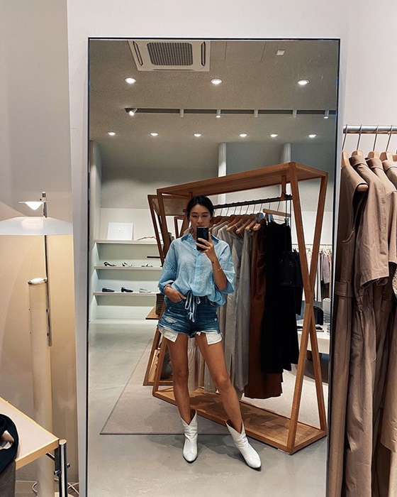 특히 짧은 바지로 인해 8등신 비율도 더욱 돋보인다. 두 아이의 엄마라고 믿기 힘든 늘씬한 몸매는 시선을 사로잡는다.