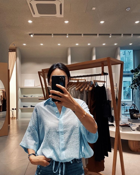 사진 속 가희는 한 의류매장에서 거울을 바라보며 사진을 찍고 있다. 얇은 하늘 색 셔츠와 반바지를 매치한 패션에서 여름 분위기가 물씬 풍긴다.