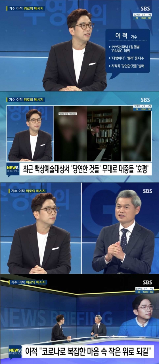 25일 오후 방송된 SBS '주영진의 뉴스브리핑'(이하 '뉴스브리핑')에 이적이 출연했다. 이날 방송에서 이적은 "4월 19일이었던 것 같다. 오전에 곡을 쓰고 오후에 머리를 하고 돌아오자마자 휴대폰으로 촬영해서 제 SNS에 올렸다"며 "갓 완성된 상태였다"고 지난 4월 공개한 '당연한 것들'의 에피소드를 공개했다.