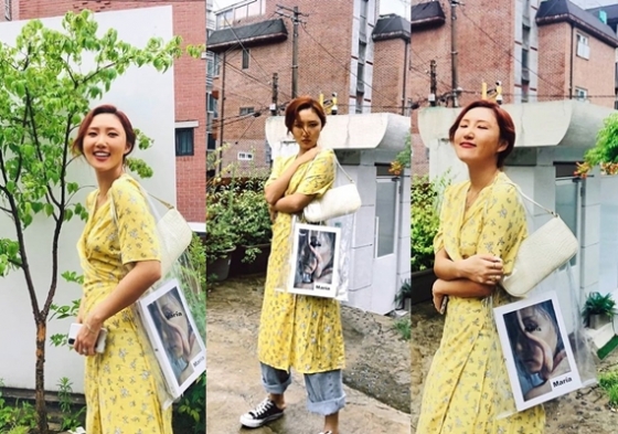 화사는 상큼한 노란 원피스를 입고, 자신의 솔로앨범을 들고 행복한 모습을 보이고 있다.