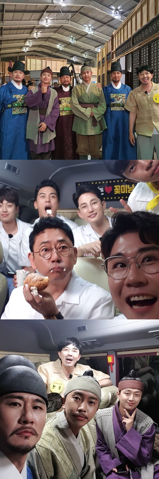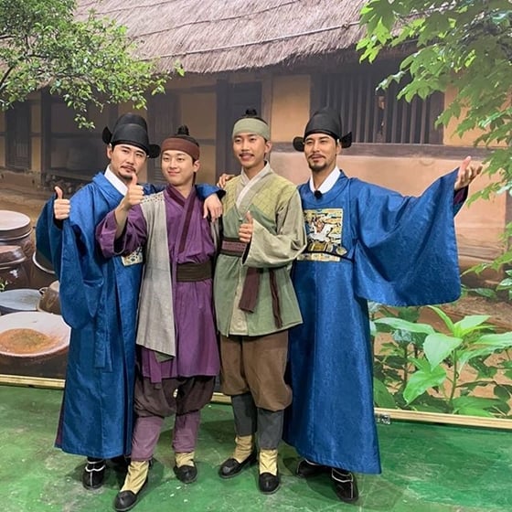 공개된 사진에는 TV조선 '뽕숭아학당'의 영탁, 이찬원, 임영웅, 장민호가 특별기획드라마 '바람과 구름과 비'에 특별출연한 의상을 입고 있는 모습이 담겼다. 또 다른 사진에는 '바람과 구름과 비'에서 네 사람과 호흡을 맞춘 전광렬과 함께 있는 모습도 있다. 이밖에 박시후, 전광렬 등과 버스 안에서 기념 촬영을 한 사진도 공개됐다. '뽕숭아학당'의 F4(임영웅, 영탁, 장민호, 이찬원)와 박시후, 전광렬의 화기애애한 분위기가 보는 이들을 미소 짓게 했다.