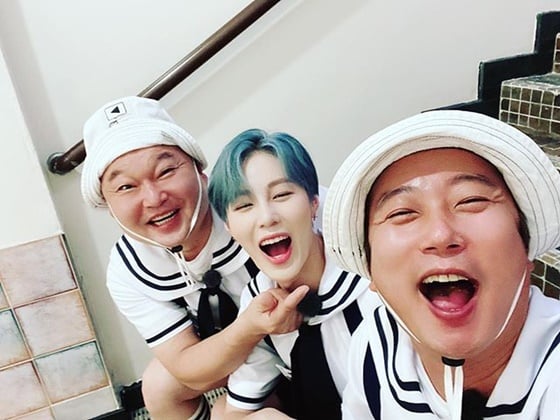 공개된 사진 속 하성운은 강호동, 이수근과 함께 미소를 지으며 카메라를 응시하고 있다. 세 사람은 마린룩을 착용해 시선을 끈다.