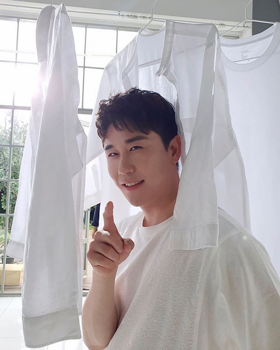 사진 속에는 흰 옷들 사이에 서 있는 영탁의 모습이 담겨있다. 옷 사이로 보이는 넓은 어깨와 눈웃음이 시선을 사로잡는다.