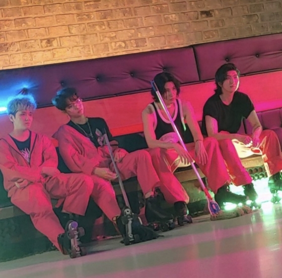 사진 속에는 핑크빛 조명 아래 네 남자가 앉아있다. 연출된 듯한 분위기에서 촬영 현장임을 유추할 수 있다.