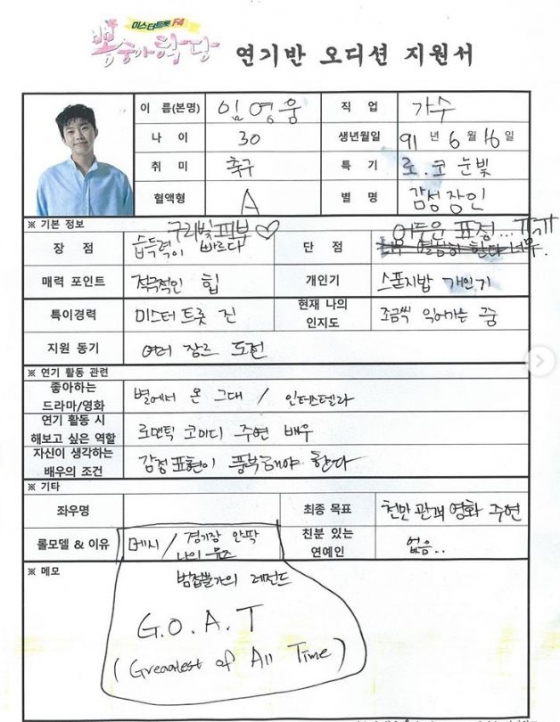임영웅은 지원서에서 장단점, 개인기, 좋아하는 드라마와 영화, 연기 활동시 해보고 싶은 역할 등을 공개했다. 그가 친필로 작성했다는 점에서 팬들은 더욱 환호하고 있다.