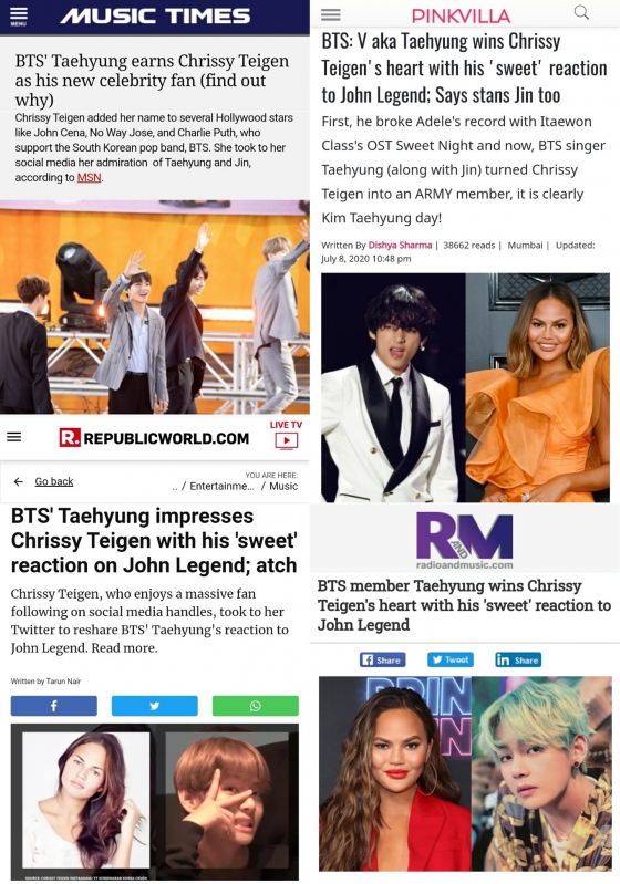 그룹 방탄소년단(BTS) 뷔가 존 레전드(John Legend)에 대한 팬심을 드러낸 영상에 존 레전드 부부가 화답해 큰 화제다.