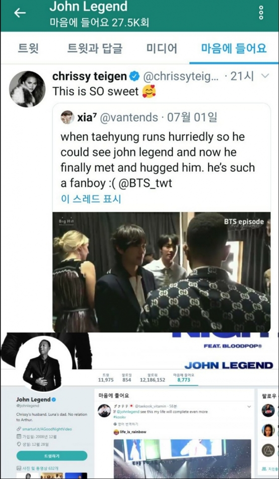 이에 존 레전드 역시 크리시가 올린 영상에 ‘좋아요’를 표해 뷔에 대한 이들 부부의 애정을 엿볼 수 있었다.