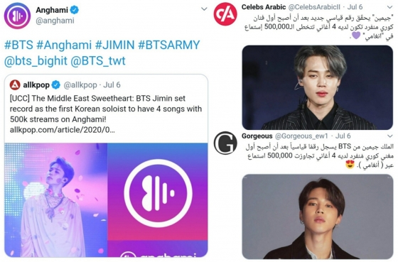중동 최대 음원 사이트 '앙가미'(Anghami)는 지난 6일 공식 트위터 계정에 이날 북미 매체 올케이팝(allkpop)이 "중동의 연인 (The Middle East Sweetheart) 방탄소년단 지민이 '앙가미'에서 한국 솔로 가수 최초로 4곡 모두 50만 스트리밍을 달성한 기록을 세웠다"는 헤드라인으로 지민의 솔로곡 기록과 중동지역 인기를 다룬 기사를 게재했다.