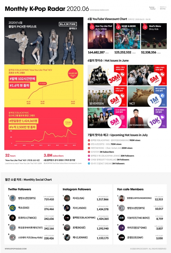 블랙핑크가 지난 6월 발표한 'How You Like That' 뮤직비디오는 지난 26주 차 집계 기간 동안 단 30시간 동안 9000만 뷰 이상의 조회 수를 달성하며 케이팝 레이더 사상 가장 높은 수치를 기록한 바 있다. 이어 발매 약 1억 2,124만 뷰를 기록해, 억대 조회수를 기록한 최초의 아티스트로 이름을 올리기도 했다.