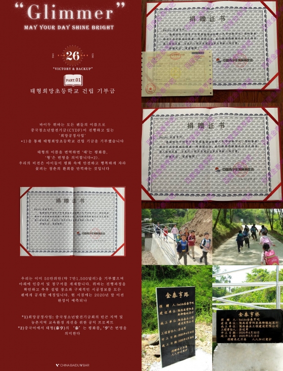 지난 11일 뷔의 중국 최대 팬클럽 바이두뷔바는 '태형 희망 초등학교'의 건립을 공식 발표했다.
