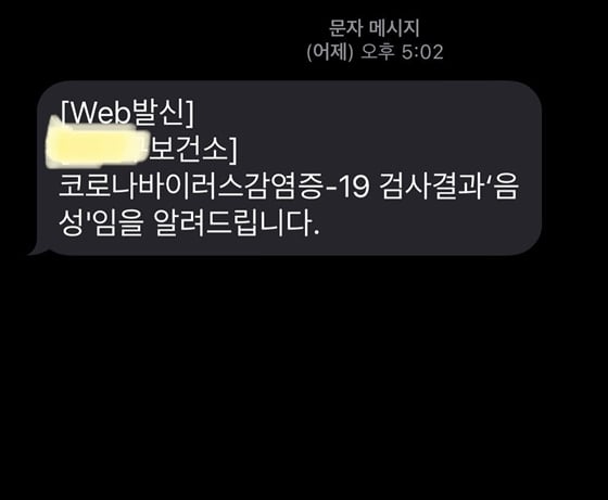 공개된 사진 속에는 코로나19 검사 결과 '음성' 임을 알리는 문자메시지가 담겨있다.