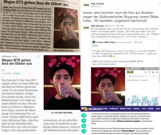 미누텐은 "팬들은 K-팝 스타 BTS의 작은 디테일도 놓치지 않는다"며 뷔가 트위터에 올린 사진으로 인해 유리컵의 재고가 줄어들었고 이를 해결하기 위해 뷔의 스위스 팬이 '스위스 이케아에서는 구입이 가능하다'는 팁을 공유하게 되었다고 전했다.