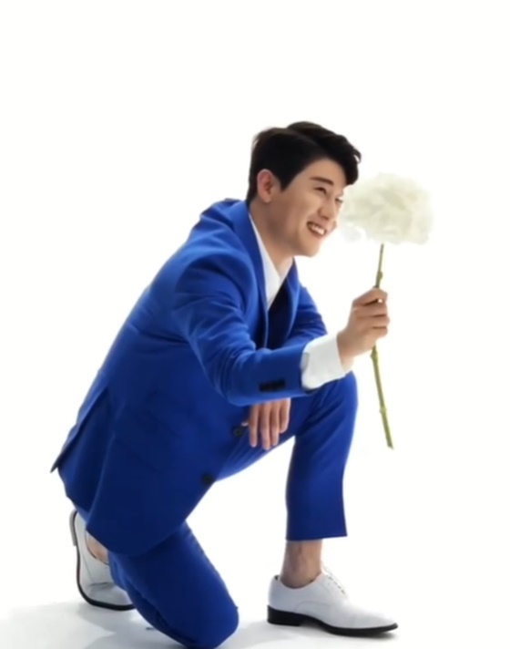 영상 속 영탁은 얼굴 크기만 한 하얀 꽃 한 송이를 들고 광고 촬영을 하고 있다.