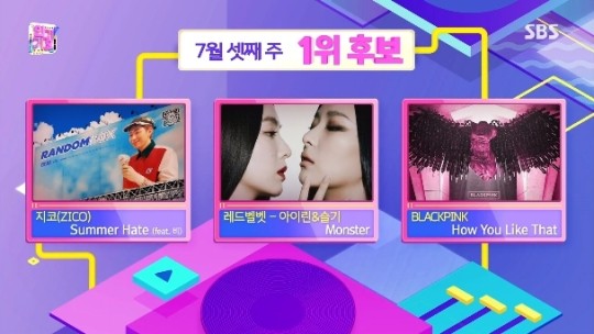 19일 오후 방송된 SBS 음악 방송 프로그램 '인기가요'에서는 1위 후보로 지코의 'Summer Hate'와 레드벨벳-아이린&슬기의 'Monster', 블랙핑크의 'How You Like That'이 올랐다.
