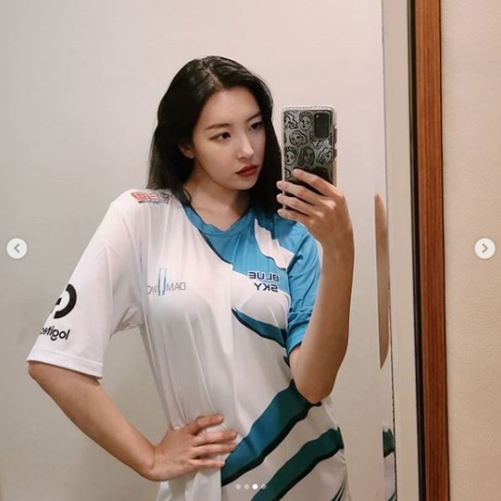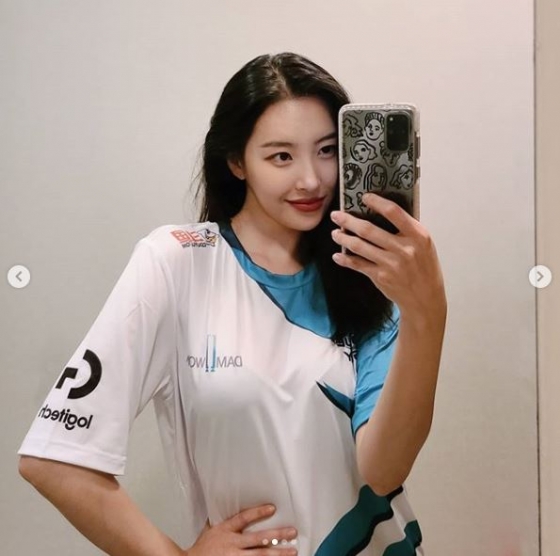 사진 속 선미는 롤 프로게이머 허수(쇼메이커)의 티셔츠를 입은 채 포즈를 취하고 있다.