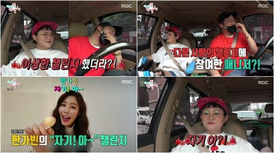 지난 18일 방송된 MBC 예능 프로그램 '전지적 참견 시점'(이하 전참시)에서는 김신영이 자신의 노래 '주라주라' 챌린지는 하지 않은 매니저가 한가빈의 '자기! 아~' 챌린지를 한 것을 알고는 질투가 섞인 분노(?)를 폭발시키는 모습을 보여 시청자들과 네티즌들의 웃음을 자아냈다.