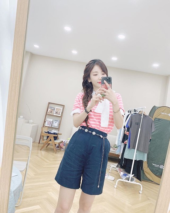 사진 속 지숙은 핑크색 스트라이프 상의와 네이비색 버뮤다팬츠를 착용한 모습이다. 캐주얼한 패션에 한쪽으로 땋아 내린 머리로 청순함까지 더했다.