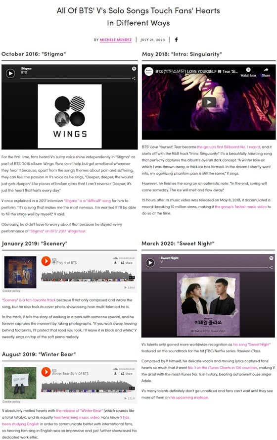 최근 미국 엔터테인먼트 전문매체 엘리트데일리는 뷔의 각 솔로곡들의 매력과 역량을 분석해 기사로 실었다.