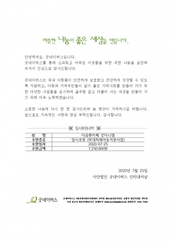 강다니엘의 다음 팬카페 '갓다니엘'은 솔로 데뷔 1주년을 맞이해 굿네이버스를 통해 강다니엘의 솔로 데뷔 날짜인 7월 25일의 의미를 담은 725만원을 기부했다.