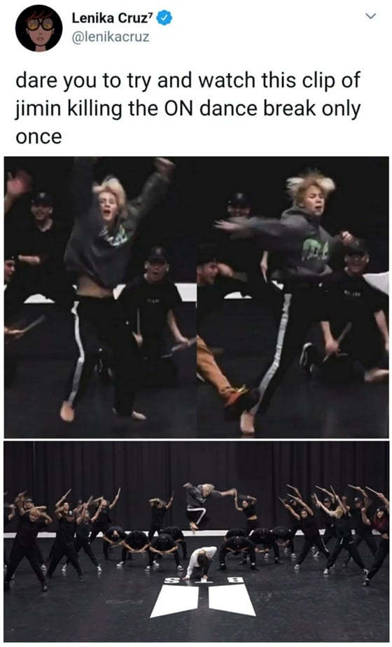지난 25일 미국 시사주간지 디애틀랜틱(The Atlantic)의 편집자 레니카 크루즈(Lenika Cruz, 이하 레니카)는 자신의 SNS 계정에 방탄소년단 공식 유튜브 채널 방탄티비(BANGTANTV)에서 공개된 'ON(온)' Dance Practice Fix ver.(안무 연습) 영상의 일부분인 댄스 브레이크 '지민 포커스' 영상을 게재해 눈길을 끌었다.