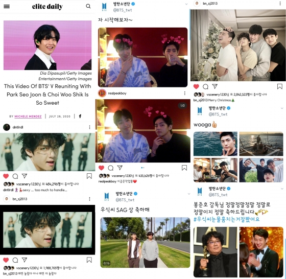 그 예로 지난 1월 최우식이 영화 '기생충'으로 SAG상을 수상했을 때 뷔가 공식 트위터에 축하 메시지를 올린 것, 2월 방탄소년단의 ‘ON’ 뮤직비디오 발매 당시 최우식과 박서준이 인스타그램에 "sexy...too much to handle...", "매번 더 놀랍다"고 응원을 보낸 것 등을 들었다.