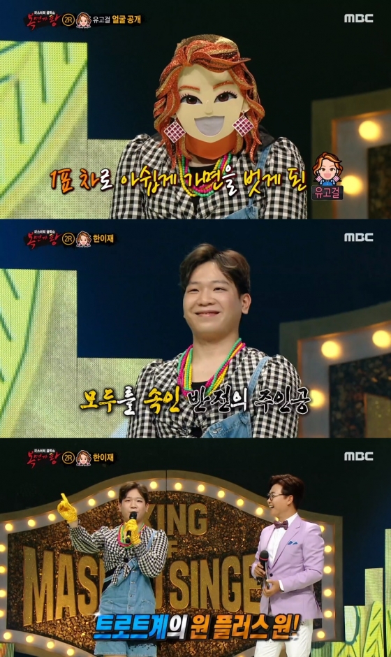 한이재는 지난 2일 방송된 '복면가왕' 2라운드 무대에서 유고걸로 등장, 빨간휴지와의 대결에서 10 대 11로 아깝게 패배하며 3라운드 진출에 실패했다. 한이재는 2라운드 무대에서 현철의 '봉선화 연정'을 부르며 자신만의 음색을 선보였다. 무대 직후 연예인 판정단은 대부분 유고걸이 여자일 것이라고 추측했지만 유고걸의 정체는 남성 보컬과 여성 보컬을 모두 소화해냈던 한이재였다. 한이재는 1라운드 무대에서는 태양을 피하는 방법과 함께 김추자의 '님은 먼 곳에'를 불렀다.