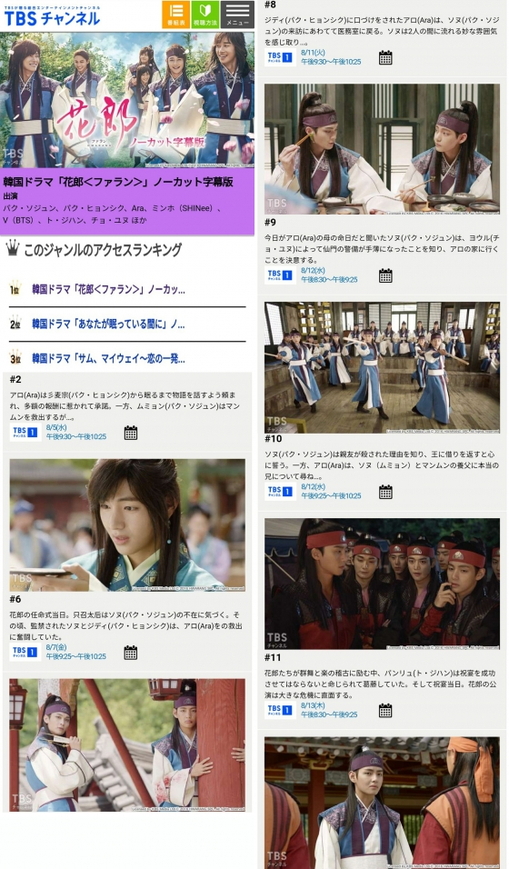 일본방송 TBS는 TBS 채널1에서 8월 5일부터 21일까지 저녁 황금 시간대에 매주 2화씩 '화랑' 전편을 방송 중이다.