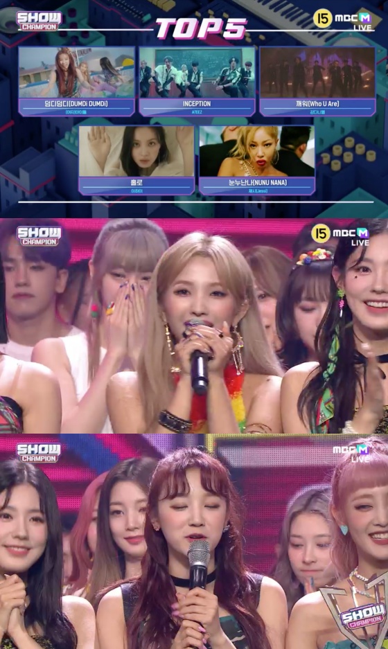 12일 오후 방송된 MBC 에브리원 '쇼! 챔피언'에서 (여자)아이들은 싱글앨범 ‘덤디덤디' 동명의 타이틀곡으로 에이티즈, 제시, 강다니엘, 이하이를 제치고 정상에 올랐다.